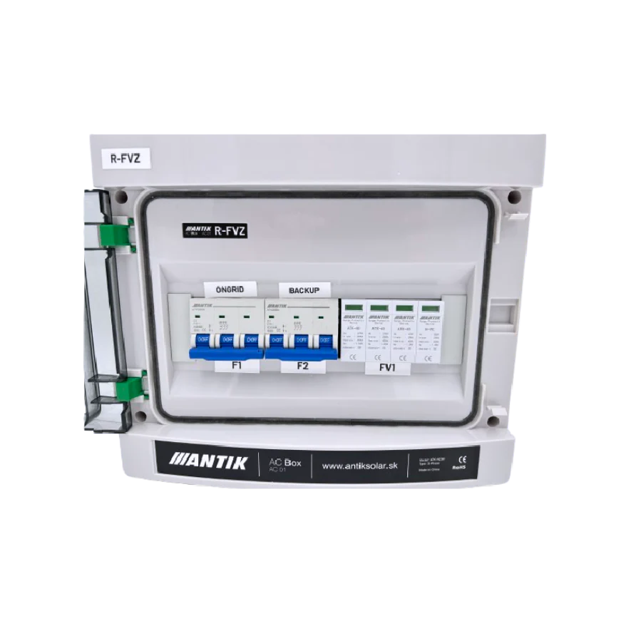 ANTIK AC Box AC01 3-fázový je 3-fázový AC rozvaděč určený pro on-grid i off-grid fotovoltaické systémy. Propojuje měnič se sítí a záložním okruhem a díky integrovaným prvkům zajišťuje stabilní a bezpečný provoz celé instalace.