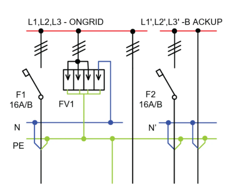 Obsahuje kombinovaný přepěťový modul ATK-SPDE40 třídy T1+T2+T3 (B+C+D), který chrání všechny fáze a nulový vodič. SPD zvládá impulsní proud do 20 kA a omezuje přepětí na úroveň 1,5 kV. Jistič F1 (ONGRID) chrání síťovou větev a F2 (BACKUP) samostatně jistí výstup pro záložní okruh.