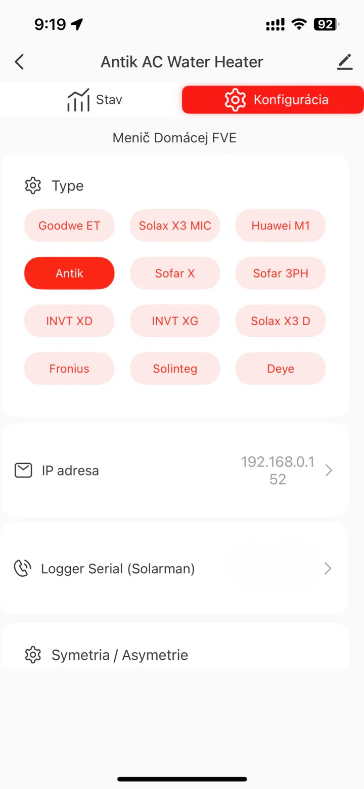 Měnič posílá do aplikace ANTIK Smart Home údaje o aktuálním přebytku vaší fotovoltaické elektrárny.