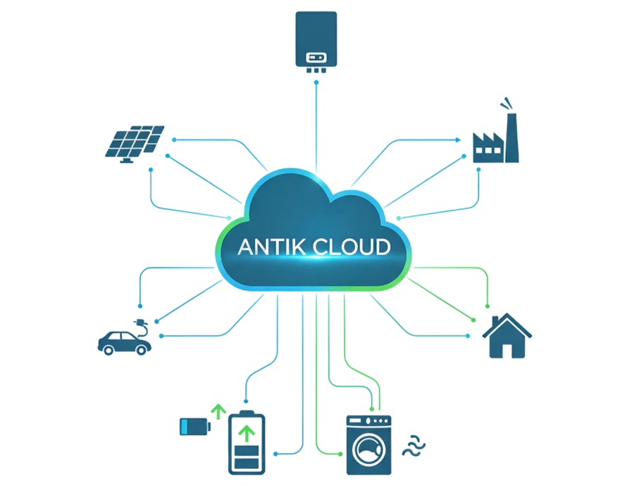 Antik Cloud umožňuje automatické řízení připojených zařízení na základě aktuálního stavu sítě, výroby a spotřeby energie. Systém dynamicky upravuje provozní režimy s cílem maximalizovat efektivitu – například při přebytku výroby upřednostní nabíjení bateriových úložišť nebo provoz spotřebičů s vysokou spotřebou.
