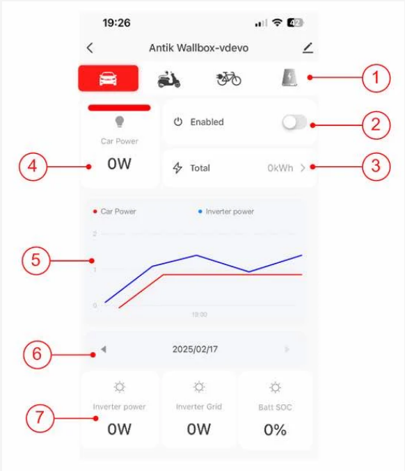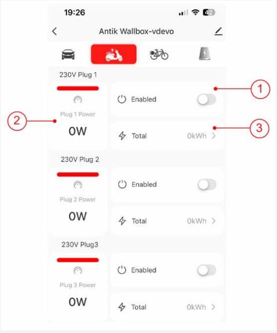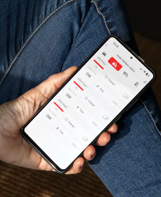 V aplikaci ANTIK SmartHome® můžete snadno ovládat a sledovat i připojené 230 V zásuvky. Každá zásuvka má samostatné řízení a přehled o spotřebě, což vám umožňuje pohodlně kontrolovat spotřebiče nebo doplňková zařízení připojená k WallBoxu.