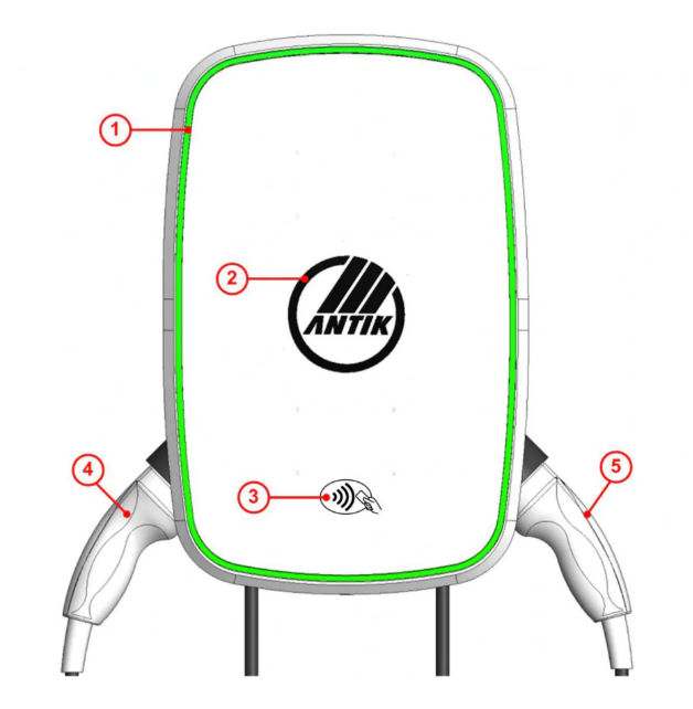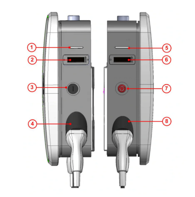 - (1) Indikační LED pás – signalizace stavu nabíječky.
