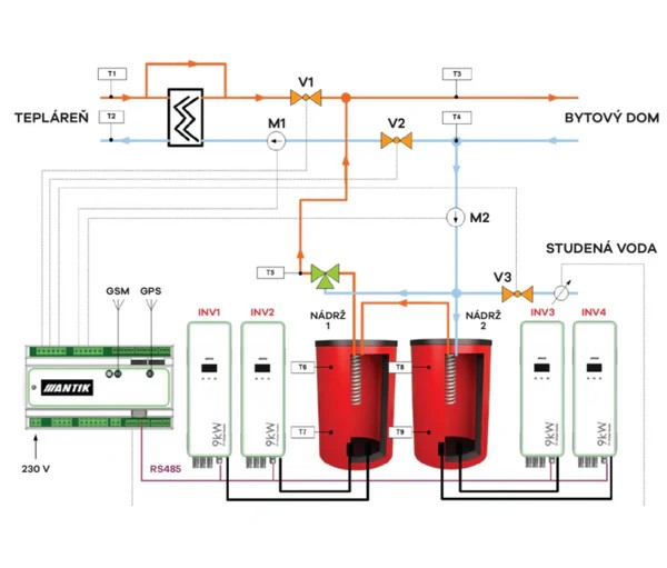 Výkonnější verze domácího 3 kW ohřevu, určená zejména pro větší objekty pro přípravu teplé užitkové vody (TUV). Zařízení je navrženo pro připojení 9 kW topného tělesa (3× 3 kW) a může fungovat samostatně nebo jako součást vícemodulového systému s řídící a komunikační jednotkou ANTIK. Ta zajišťuje koordinované řízení ventilů, čtení vodoměrů a ovládání oběhových čerpadel v rámci jednoho technologického celku.