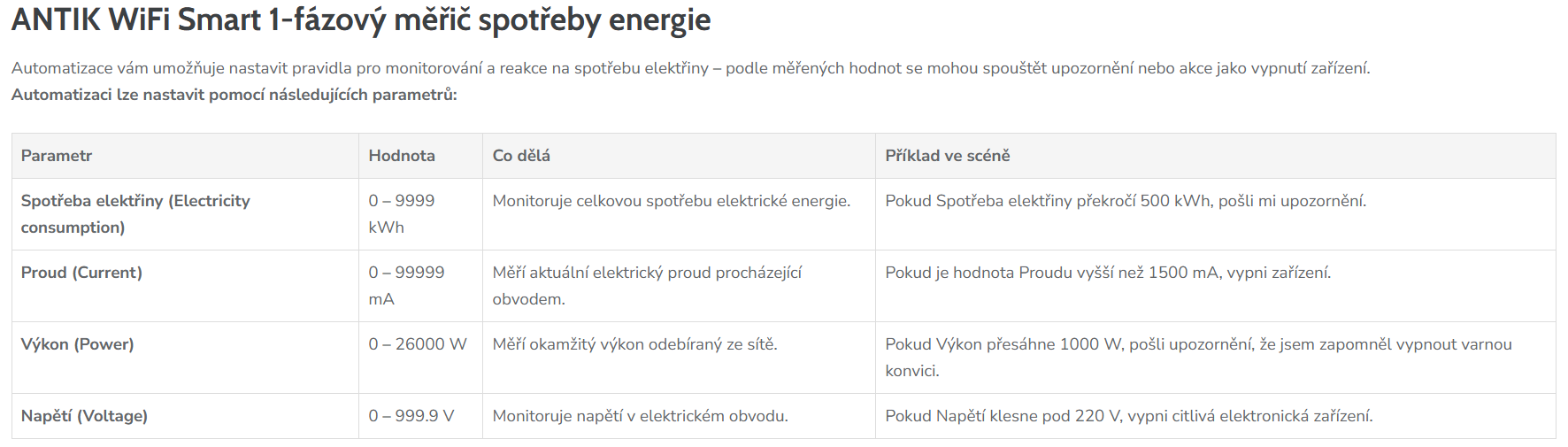 - Nastavit upozornění nebo automatizace při překročení vámi zvolené hodnoty (např. výkon nad 1000 W)