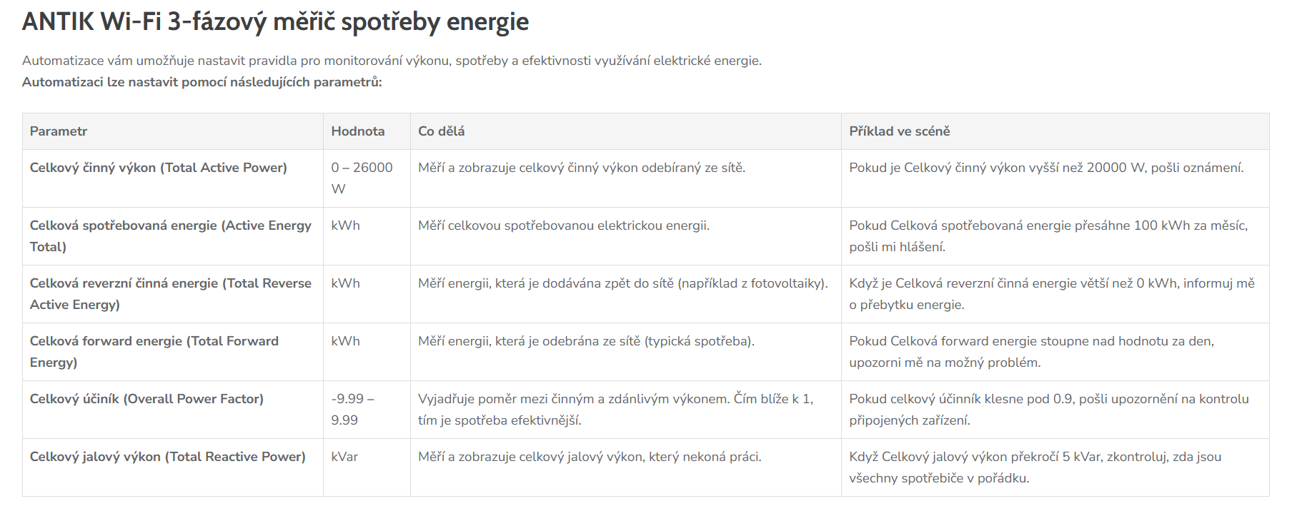 ANTIK WiFi Smart Home Meter představuje víc než jen měřič spotřeby – je plnohodnotným prvkem inteligentního ekosystému ANTIK SmartHome. Díky kompatibilitě s ostatními zařízeními dokáže spolupracovat s osvětlením, vytápěním, chlazením či jinými prvky chytré domácnosti. Na základě aktuálních měření lze vytvářet automatizační scény, které zvýší komfort a zároveň sníží náklady.