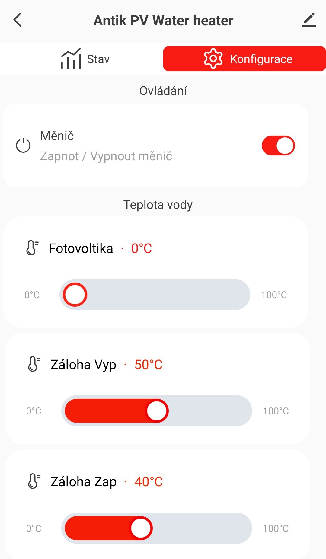 Nastavení fotovoltaiky na hodnotu 0 °C znamená pro měnič, že bude prioritně dohřívat bojler z fotovoltaického zdroje až do okamžiku, kdy dojde k odpojení termostatu bojleru. V této fázi měnič detekuje nulový proud na primárním výstupu a vyhodnotí, že ohřev vody je dokončen a bojler již neodebírá energii.