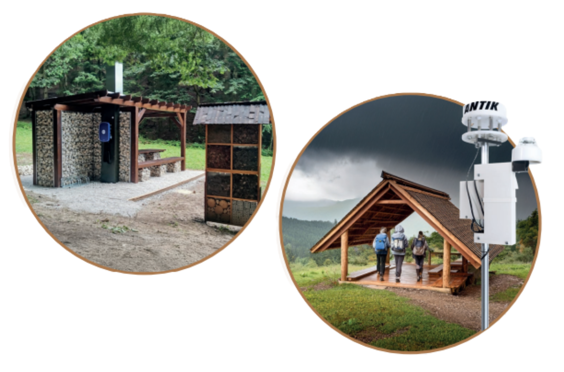 Altán s různými funkčními prvky, jako je fotovoltaika pro nabíjení kol, mobilních zařízení a osvětlení, zda placená výdejna dřeva, poskytuje dokonalé spojení komfortu a moderních technologií.