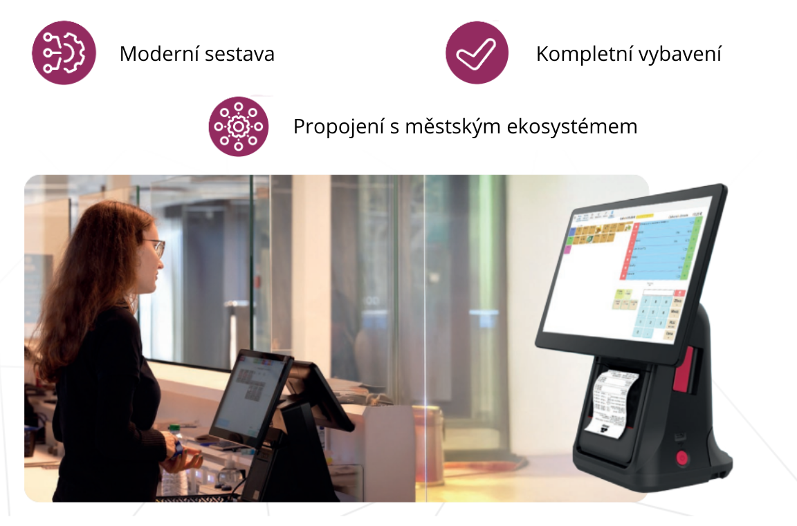 Řešení obsahuje dotykový displej obsluhy, zákaznický displej, vestavěnou tiskárnu, pokladní zásuvku, POS terminál, skener čárových kódů a RFID čtečku. Provozy v rámci města mohou být vzájemně propojeny a management má plný přehled o datech v centrálním systému GDS.