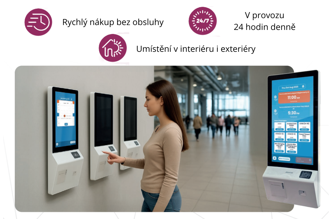 Kiosk disponuje velkým dotykovým displejem, který návštěvníka intuitivně provede výběrem služby, termínu, místa či typu vstupného. Platba probíhá přímo na kiosku prostřednictvím platební karty nebo naskenováním QR kódu. Po úhradě zařízení automaticky vytiskne potvrzení a vstupenku.